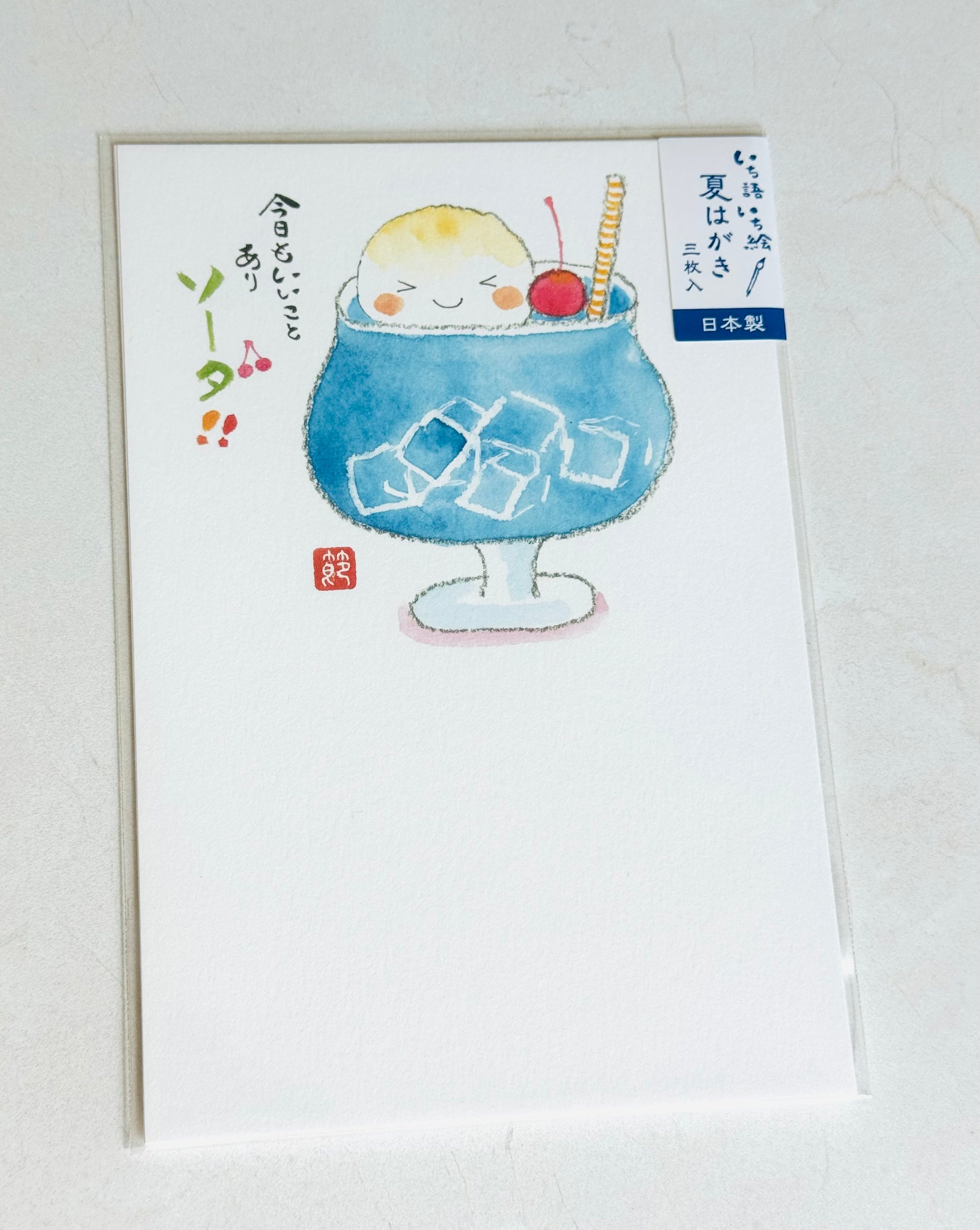 Adorable smiling vanilla ice cream on top of cream soda! The Japanese writing on the postcard translates: ”Good things are to come today! Soda!”