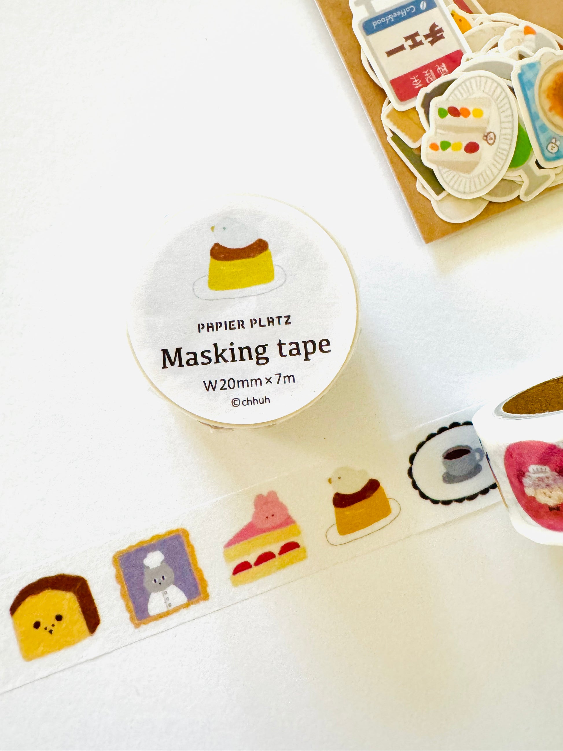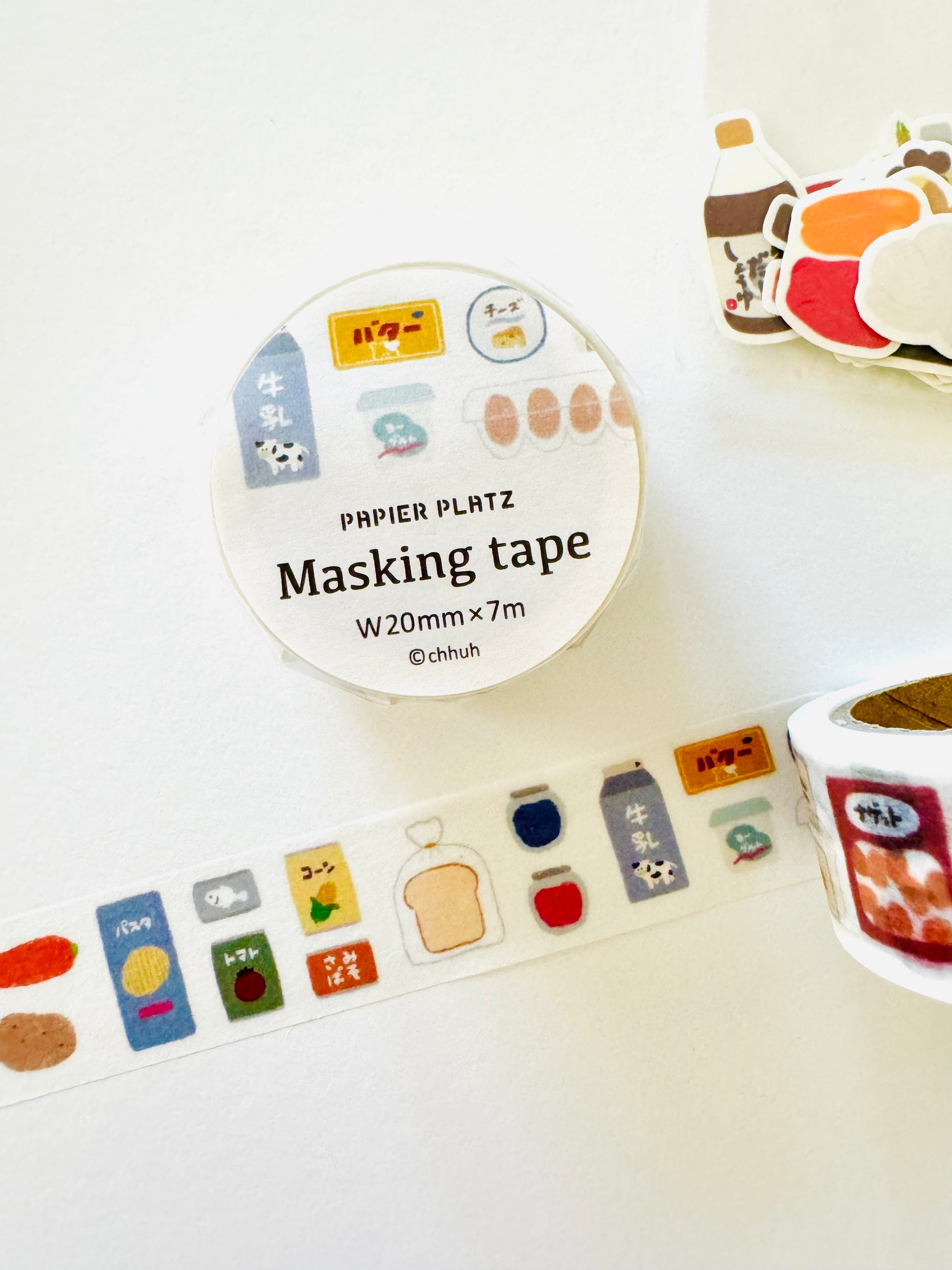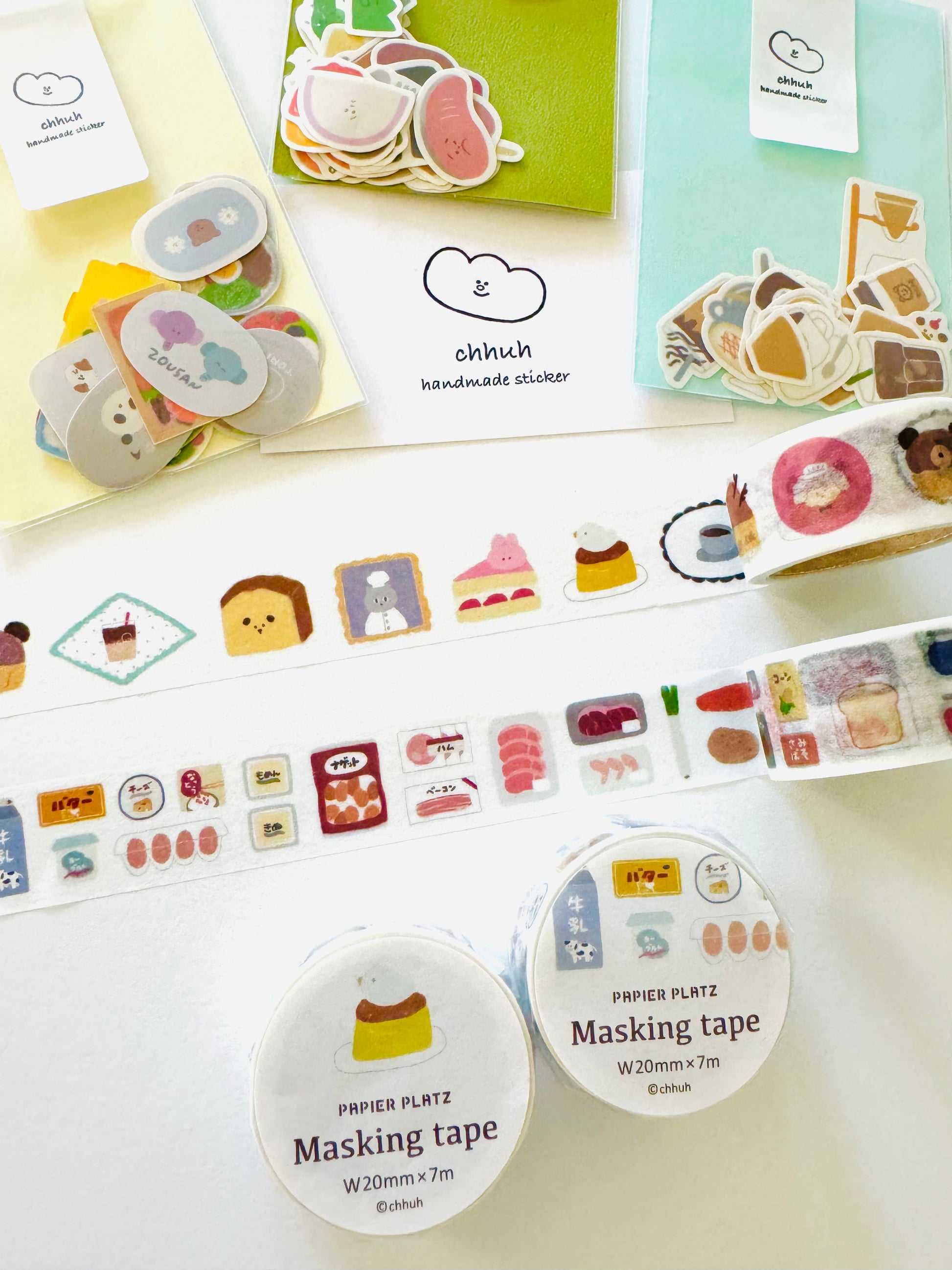This is such an exciting collaboration for foodies! Japanese creator chhuh has been designing and making handmade stickers for a few years now, and her aesthetic has generated a huge fan base (myself included, with a collection of my own)! The lovely team at Papier Platz company has now released a special collaboration of her signature food designs into washi tape! Offered are two styles — animal cafe and supermarket.